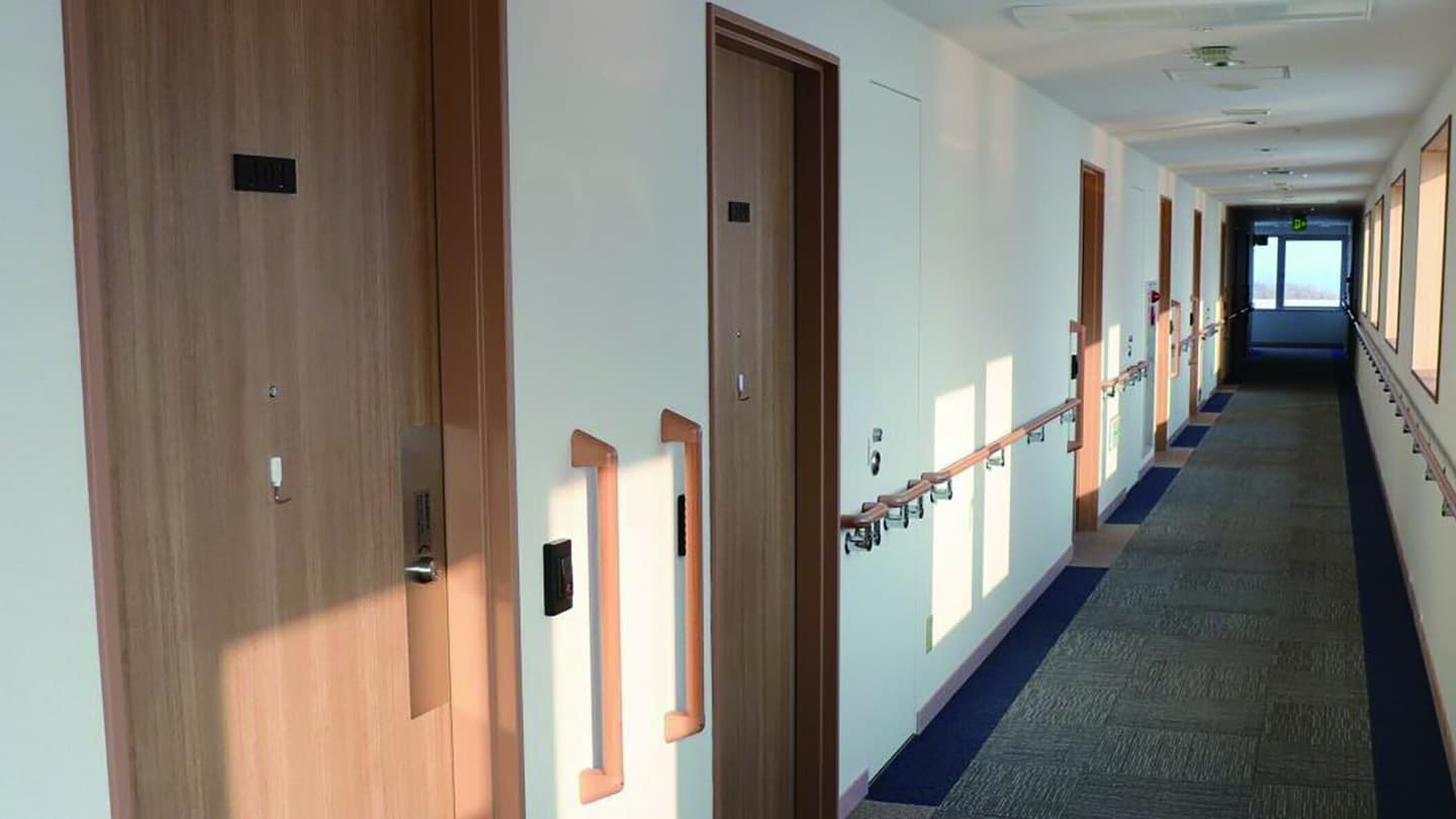 3階バリアフリーフロアには、廊下や客室入口などに手すりを設けております。客室はユニバーサルデザインで、段差が無く、各所に手すりを設置。床は車椅子でも楽に通れるよう硬いカーペットが敷かれています。また入口は車椅子でも楽に通れる広さを確保し、お部屋の中も車椅子で自由に行き来できる広さです。【部屋数 和室2室/洋室6室】